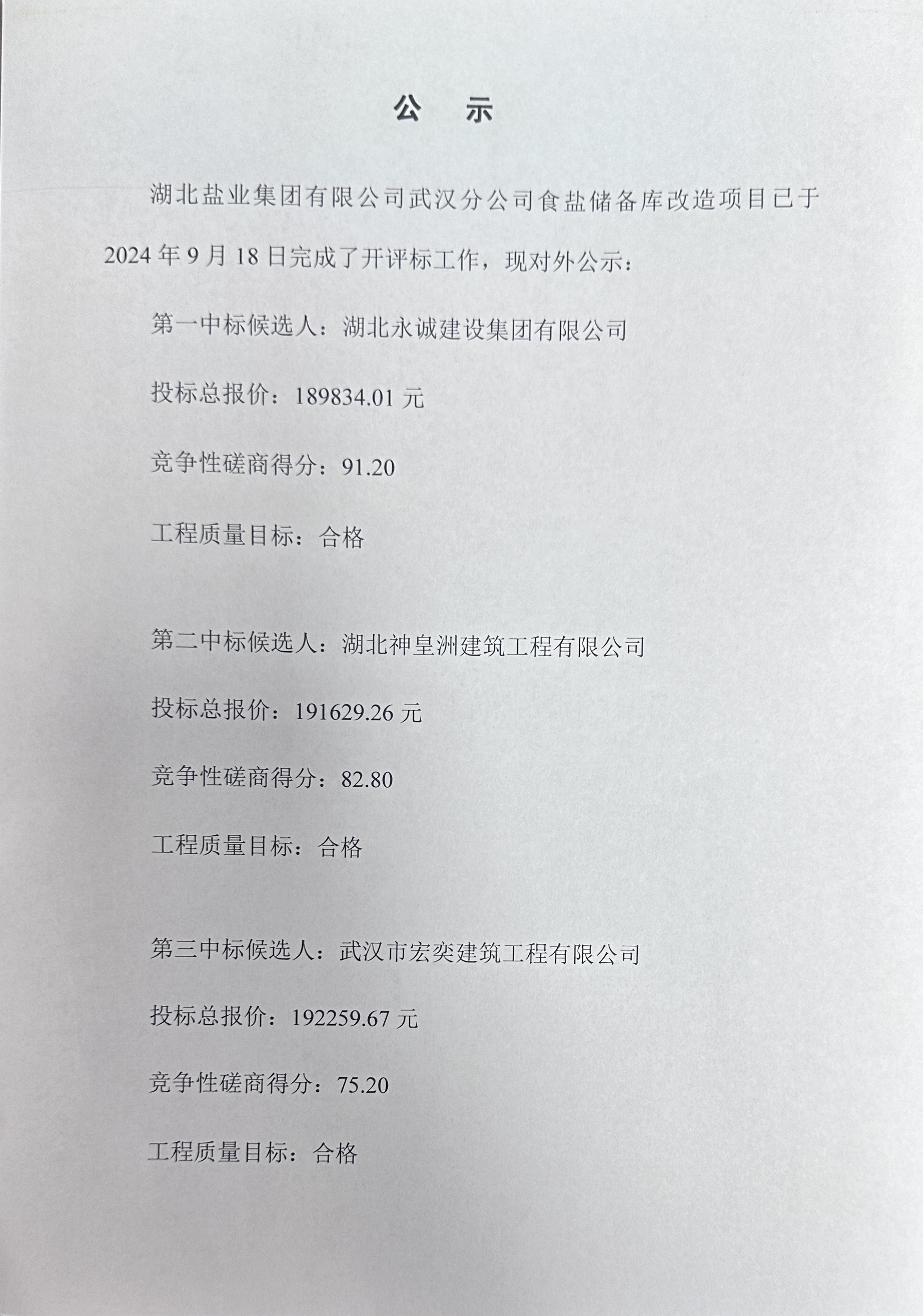 公示(湖北鹽業(yè)集團(tuán)有限公司武漢分公司食鹽儲(chǔ)備庫改造項(xiàng)目 招標(biāo)結(jié)果)